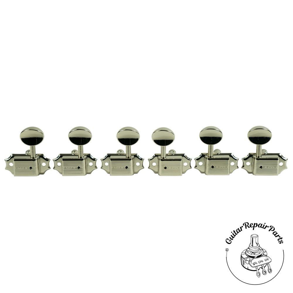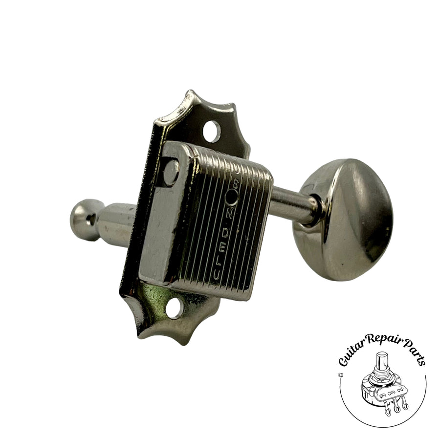 This complete Kluson® set of 3 per side tuning machines is available with oval metal buttons and a high quality nickel plating with an improved 15:1 gear ratio for more stable and accurate tuning. The housing and button type are period correct for a variety of production dates.