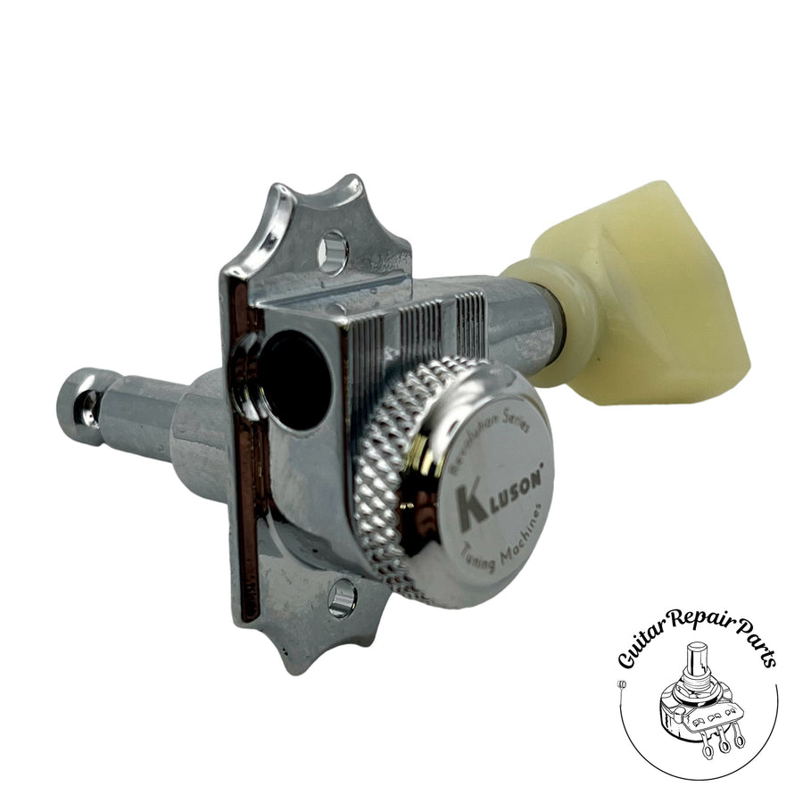 The Kluson® Revolution 19:1 high ratio G-Mount tuning machine. Kluson® has truly introduced a game changer with the traditional footprint and newly designed sealed diecast housing. These state of the art tuning machines are designed to directly retrofit diecast tuning machines with a hex head bushing and adding a rear knob locking mechanism, traditional Kluson® two-screw mounting pattern and modern 25/64 inch peghole.