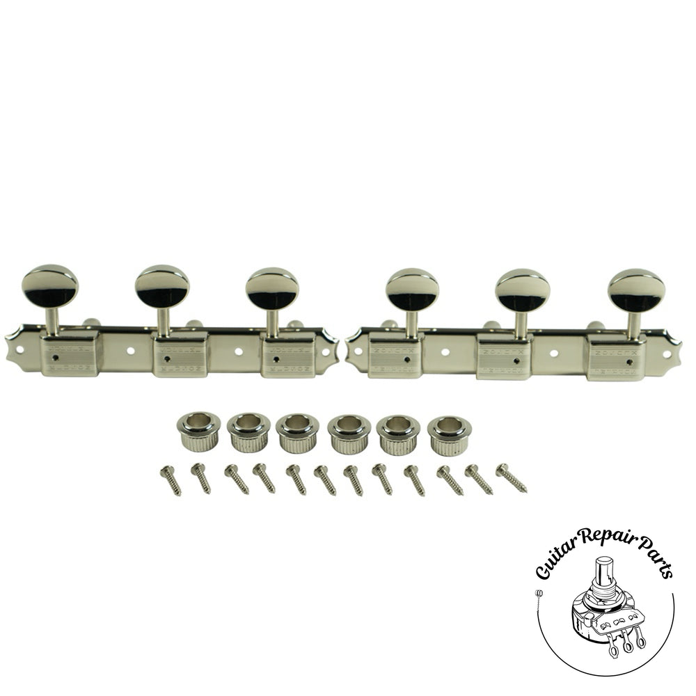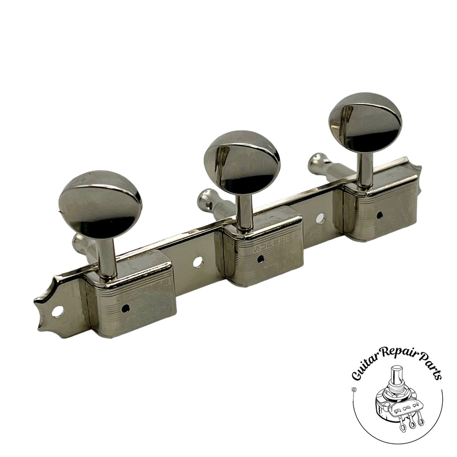 The Kluson® Supreme series tuning machines have an 18:1 gear ratio in the traditional stamped steel housing. This particular set is designed for instruments using a plate mounted 3 + 3 tuning machine set with an upgraded gear ratio to original machines.