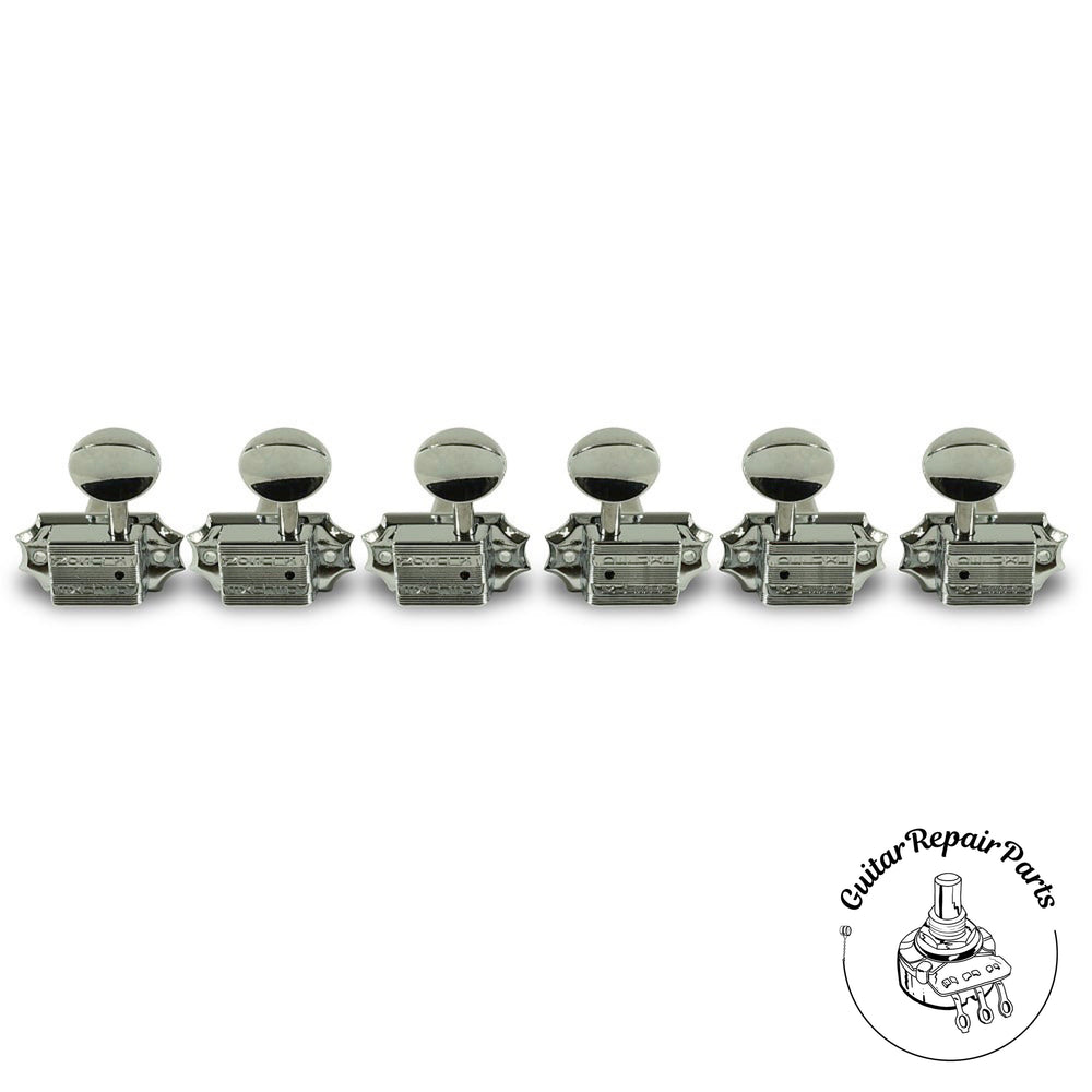 Kluson 3 per side design with modern functionality utilizing the classic footprint and mounting screw pattern. As previously used on Gibson guitars. This 15:1 gear ratio diecast set of tuning machines mounts with 10mm bolt bushings and washers. Includes all mounting hardware.